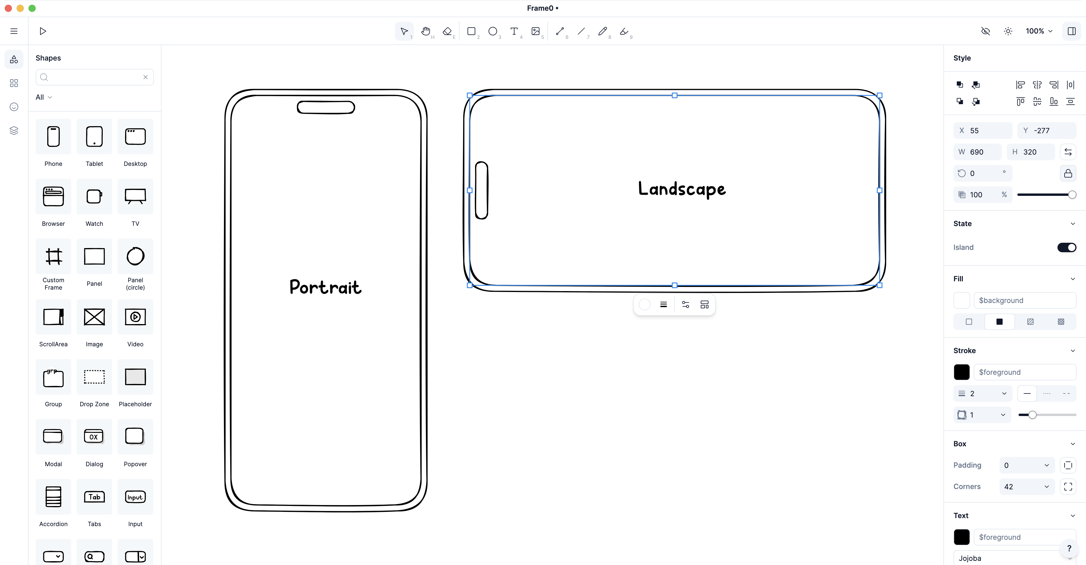 On mobile or tablet, it is often necessary to design for both landscape and portrait orientations. To accommodate this, a feature has been included that allows for easy adjustment of height and width. In the Inspector sidebar, next to the height and width input fields, there is a button that allows you to swap them.